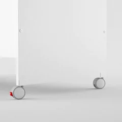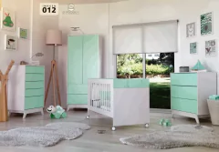 Posee 4 ruedas, 2 de ellas con freno. Se presenta en 3 colores (detalles) gris claro, salmón y aqua; el resto de la cuna es completamente blanca.